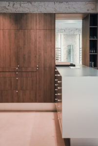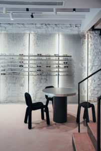 Le design du magasin a été confié à l’architecte Johany Sapet, connu à Lyon pour l’architecture de Prairial, le Troquet, la charcuterie Sibilia… Il a imaginé un espace résolument contemporain, alliant béton rose, bois foncé et métal brossé. La boutique abrite un étage conçu comme un boudoir, offrant aux clients une expérience de vente inédite, haut de gamme et intimiste où l’on peut également réaliser des examens de vue.